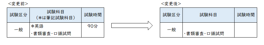 試験区分「一般」において英語筆記試験を廃止する。なお、 英語能力の審査については出願書類に英語外部試験スコアを含むことにより行う。